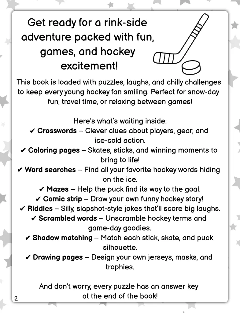 Bring the excitement of the rink to life with every page! This fun and creative book is packed with action scenes, smiling players, and winter sports adventures that boys and girls will love. From goal celebrations to fun practice moments, each illustration captures the teamwork, energy, and joy of playing together on ice.