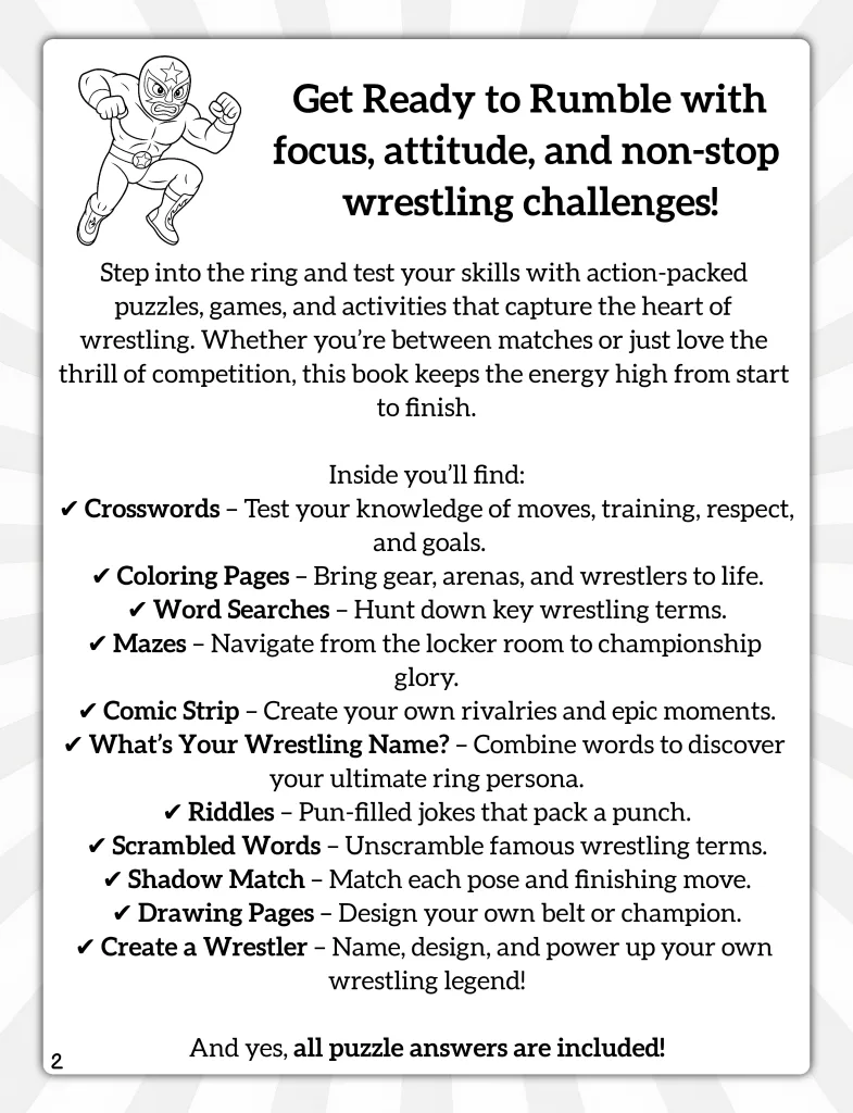 Grab a copy today and let the ultimate showdown of puzzles, creativity, and fun begin inside the pages of The Epic Wrestling Activity Book! 🏆