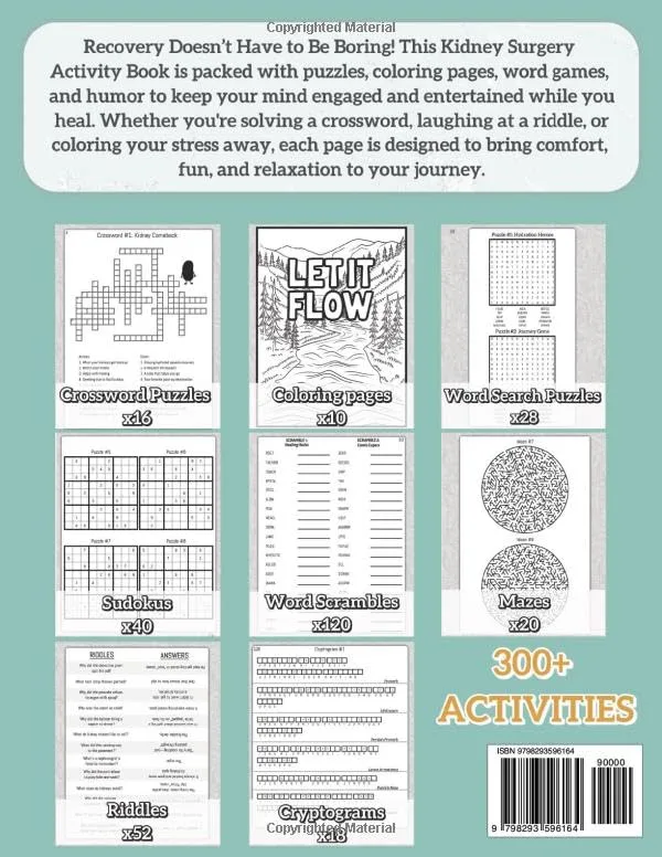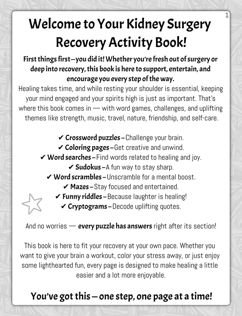 Packed with lighthearted word games, brain teasers, coloring pages, and quirky puzzles, it’s the perfect companion when you’re stuck resting, waiting at appointments, or just need a little mood boost. 🧩✍️ Whether you’re a kidney donor, transplant recipient, or navigating dialysis, every page is designed to help pass the time with humor and heart.