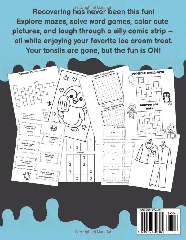 Turn sore-throat days into giggle-time with this gentle tonsil surgery activity book for ages 3–8. Filled with easy mazes, coloring pages, word games, and silly ice cream–themed challenges, it keeps kids happily distracted without using much energy. Perfect for recovery baskets, hospital care packages, or a sweet “get well soon” surprise.