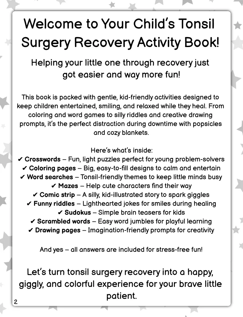 Having your tonsils out isn’t the most exciting adventure… but it can be! This cheerful activity book is packed with games, coloring pages, mazes, word puzzles, and giggle-worthy challenges to keep little ones happy and distracted while they heal.